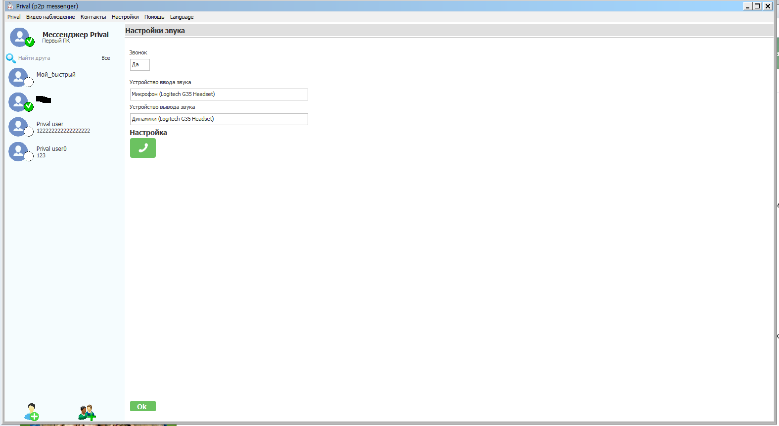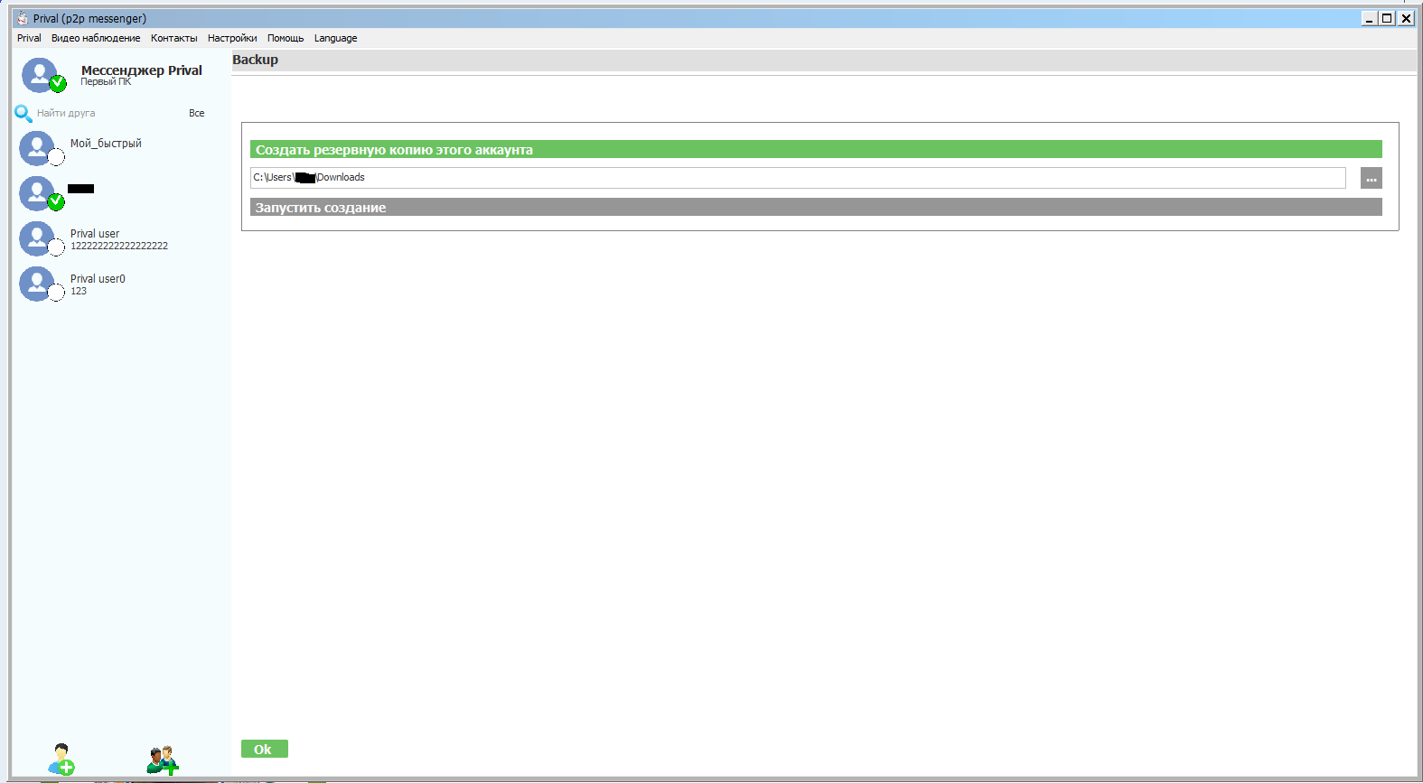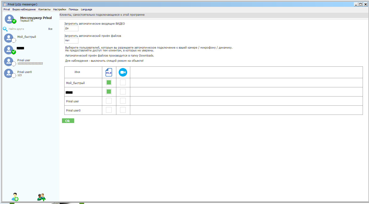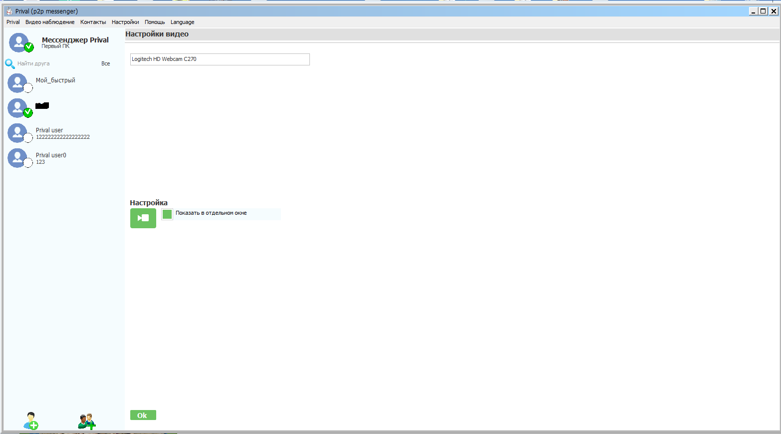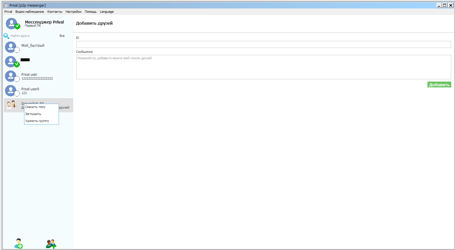 2. После отправки сообщения, если удалённый друг не в сети, то для того, что-бы собеседник получил сообщение требуется не останавливать клиент Prival